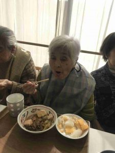 すき焼きの下準備は入居者様に手伝って貰い、慣れた手つきで材料を切られていました。