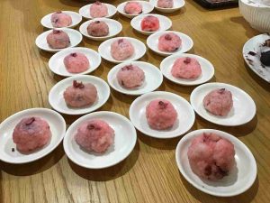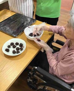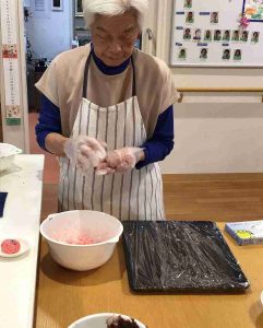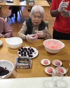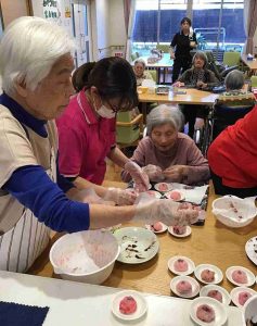 材料は、ごはん、あんこ、砂糖、塩と、いたってシンプル。「何が出来るかな?」と入居者様と職員が協力して和気あいあいとお話ししながら丁寧に丸めていきます。